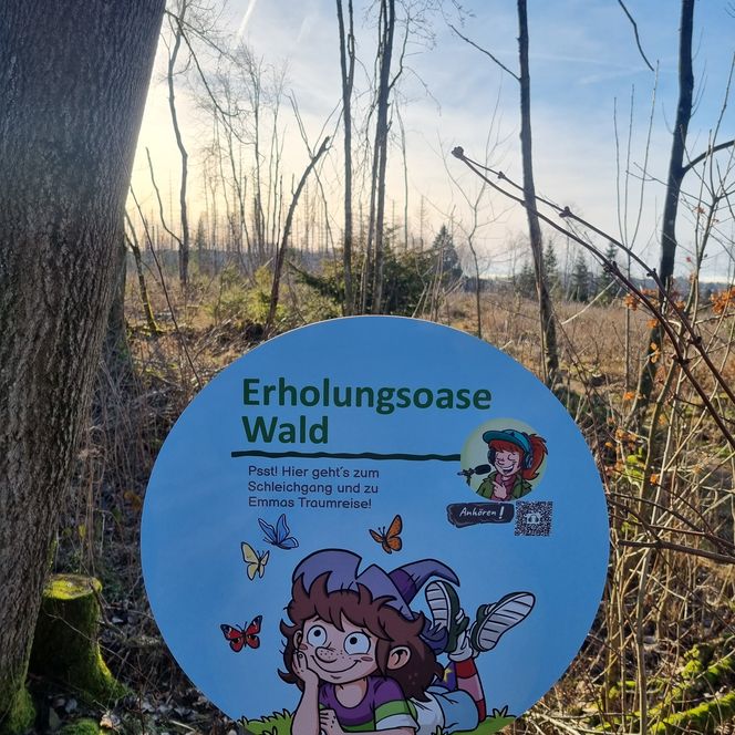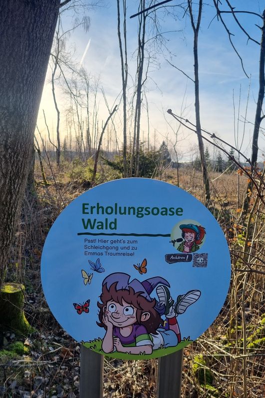 Die Netzabdeckung entlang des Weges ist gut, sodass auch ein Abruf in der Natur möglich sein sollte. An den Stationen befinden sich QR-Codes, hinter denen die Tonspuren ebenfalls hinterlegt sind. Das Symbol von Hanna und Luke am Mikrofon weist euch darauf hin.
