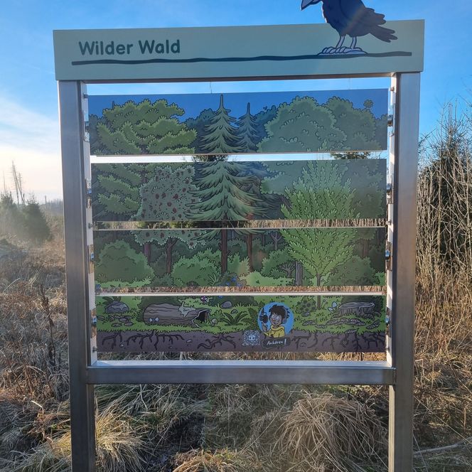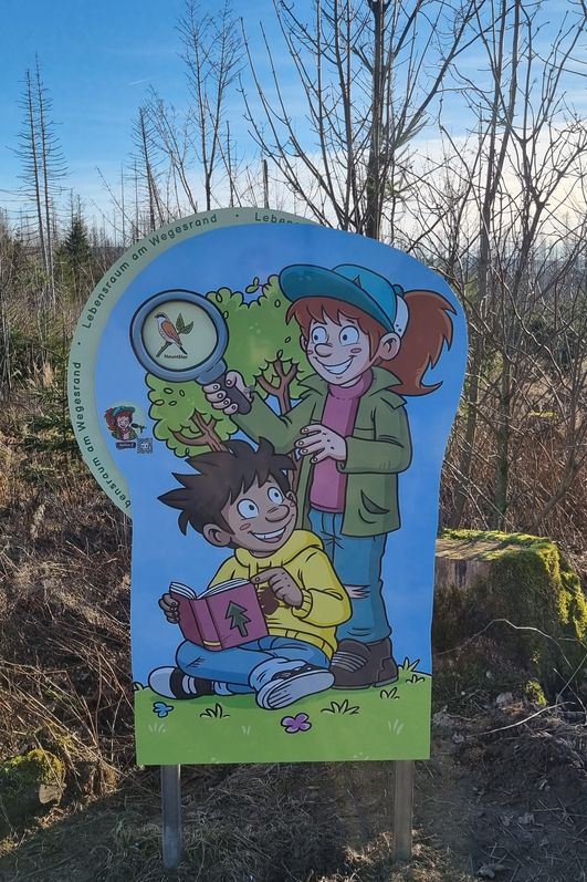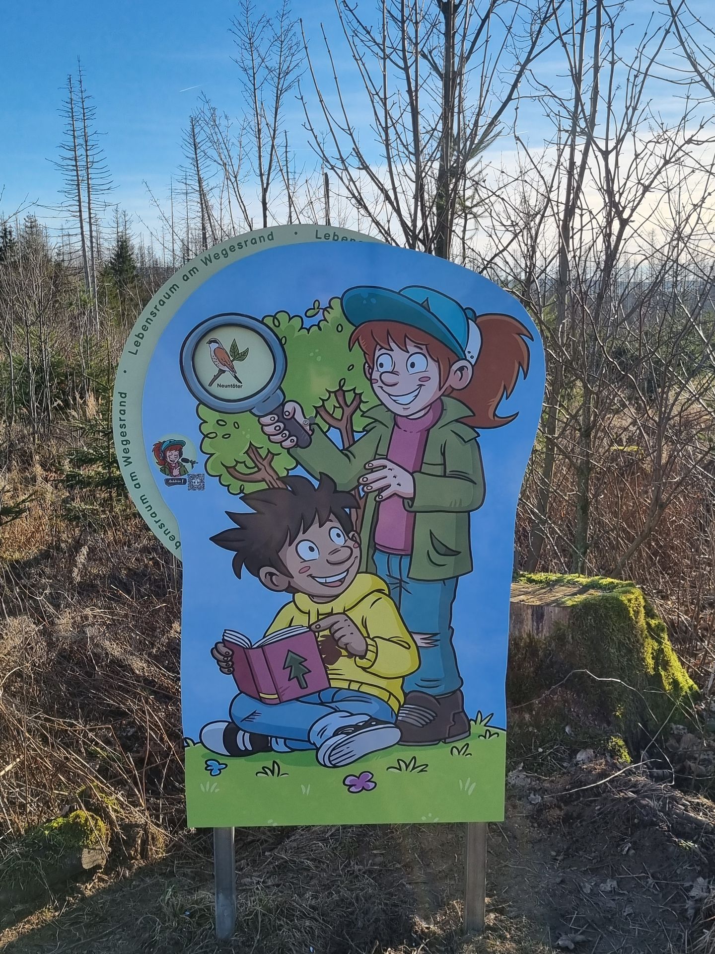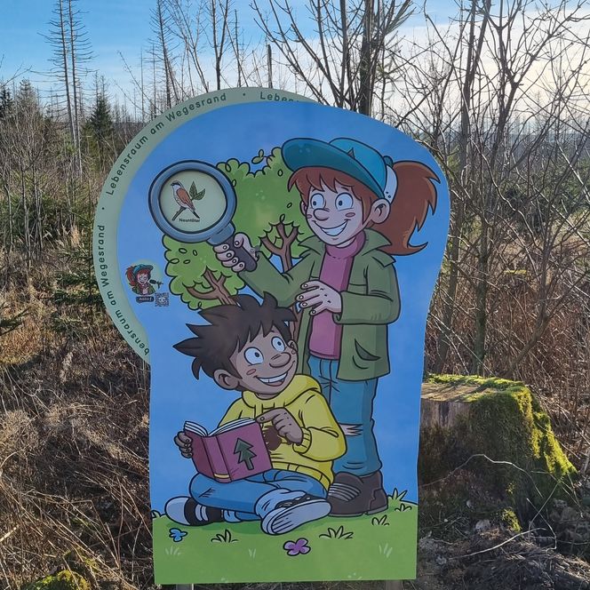 Antworten auf diese und viele weitere Fragen bekommt ihr, wenn ihr euch mit Hanna, Luke und Pjotr von der Brockenbande auf den Rundwanderweg des Klimalehrpfads Wald begebt. Nach einer Einführung am Wanderparkplatz (Alte Fuhrherrenstraße) erwarten euch entlang des Weges acht spannende Infopunkte, an denen ihr Interessantes und Wissenswertes zum Wald als CO2-Speicher, Rohstofflieferant für Holz oder Lebensraum für zahlreiche Tierarten erfahrt. Neben Elementen zum Drehen, Klappen und Austarieren gibt es für euch an jeder Station auch ein Audio mit den Freunden der Brockenbande zum jeweiligen Thema. Zudem haben sie auf ihrem Rundweg Frau Barke und Herrn Rudolph von den Niedersächsischen Landesforsten getroffen, die ihr Wissen im Interview anschaulich an zwei der Stationen geteilt haben.